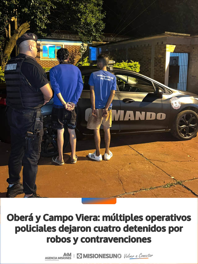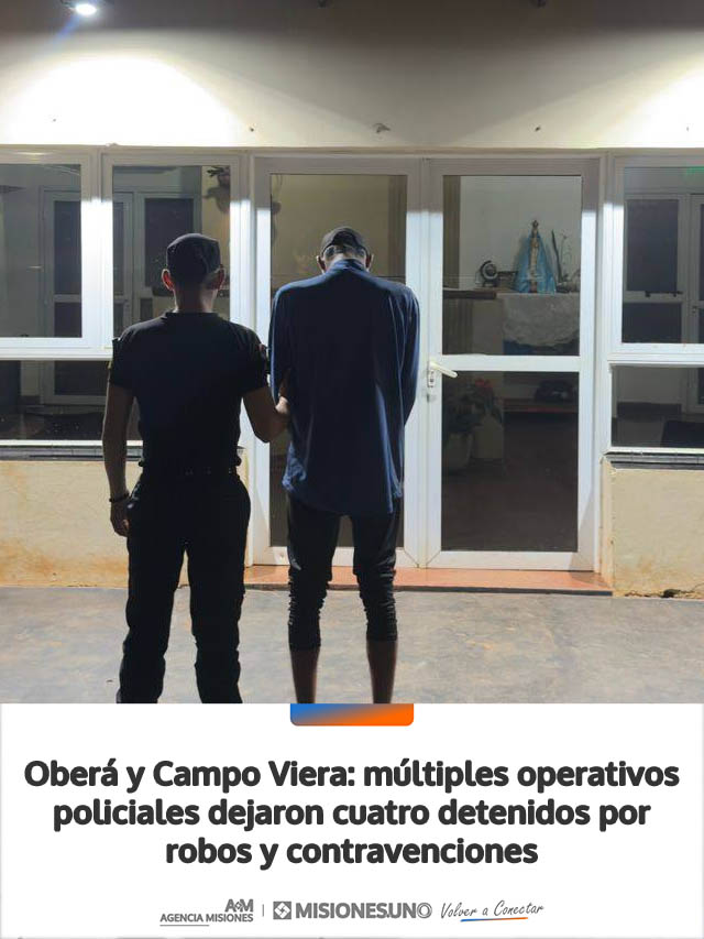 AGENCIA MISIONES.UNO | Durante la noche del miércoles y la madrugada de este jueves, distintos procedimientos realizados por la Policía en Oberá y Campo Viera culminaron con la detención de cuatro hombres, en el marco de hechos delictivos y contravencionales.