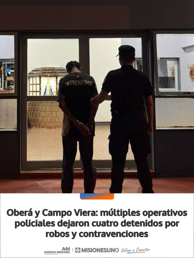Finalmente, alrededor de las 06:00 horas, personal de la División Comando Radioeléctrico junto a la Comisaría de Campo Viera actuó ante la denuncia de un vecino que indicó que desconocidos habían violentado su vehículo en una cancha del barrio Cinco Bocas, sustrayendo documentación, pertenencias y dinero. Tras un rápido operativo, los efectivos localizaron a dos sospechosos que intentaron darse a la fuga, siendo reducidos e identificados como hombres de 29 y 35 años, ambos con antecedentes, quienes quedaron a disposición de la Justicia.